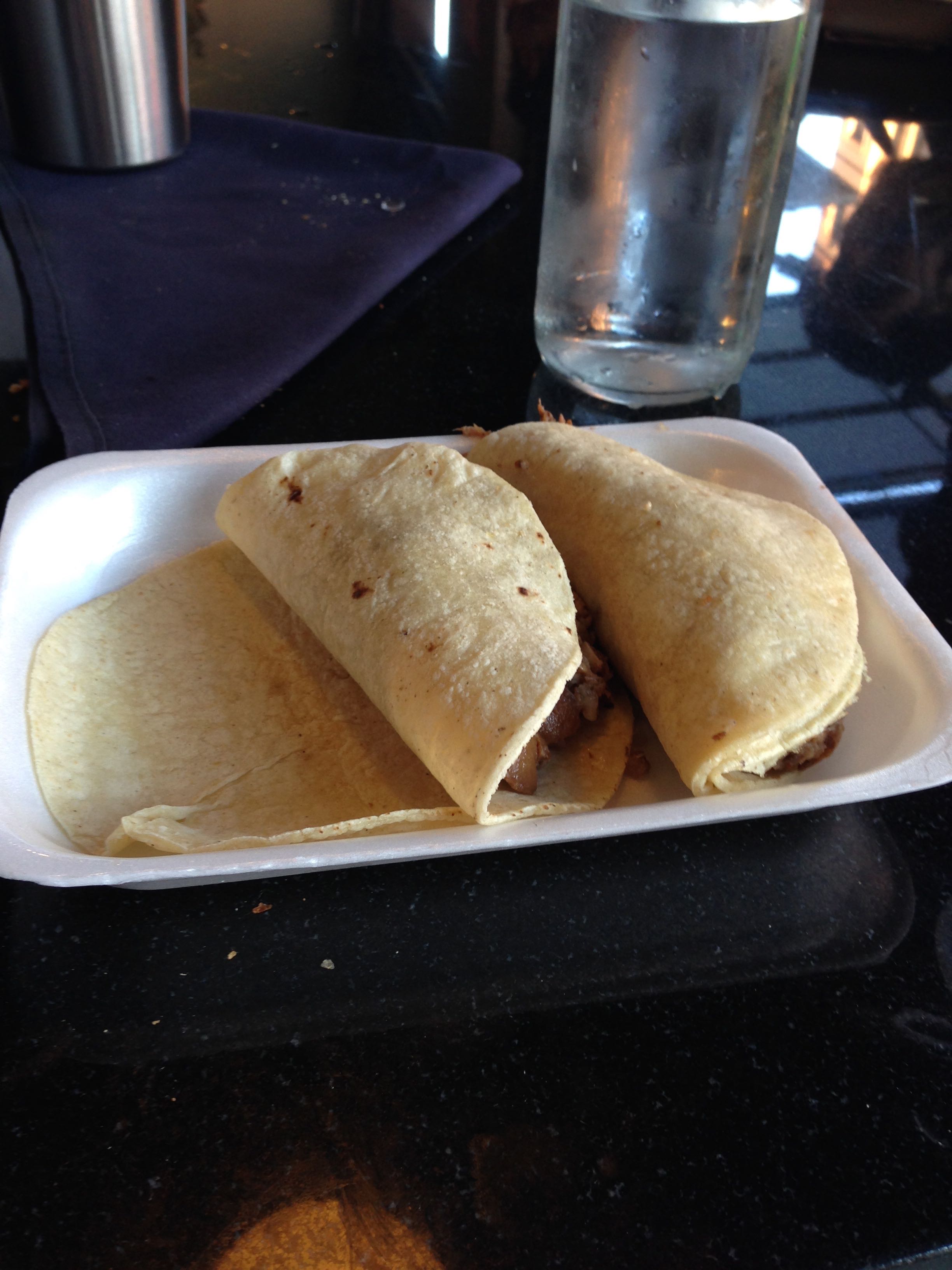 So we decide to have Egg Slut. Yes a very interesting name but good food. We decide to both have the Egg Slut which is an easy dish of mash potato and a egg on top that is poached in a jar with some salt and garnish on top with a fresh piece of bread. So simple but so nice. The potato was creamy and the egg was beautifully cooked. Before eating you are told to mix it all together and deep the bread inside. The bread is crispy on the outside and fresh. Yummy!Also we had Las Morelianas. A Mexican joint. Menu only in Mexican and when you walk on up they give you some pulled pork with a tortilla to try. It was so good. My cousin ordered one each for us. The ones you orders are bigger than the sampler and you got two tortilla with your meat. I also added some hot sauce which was fantastic. So simple but so effective. You can add other stuff to the tortilla but my cousin just ordered it with pork. Yummy.