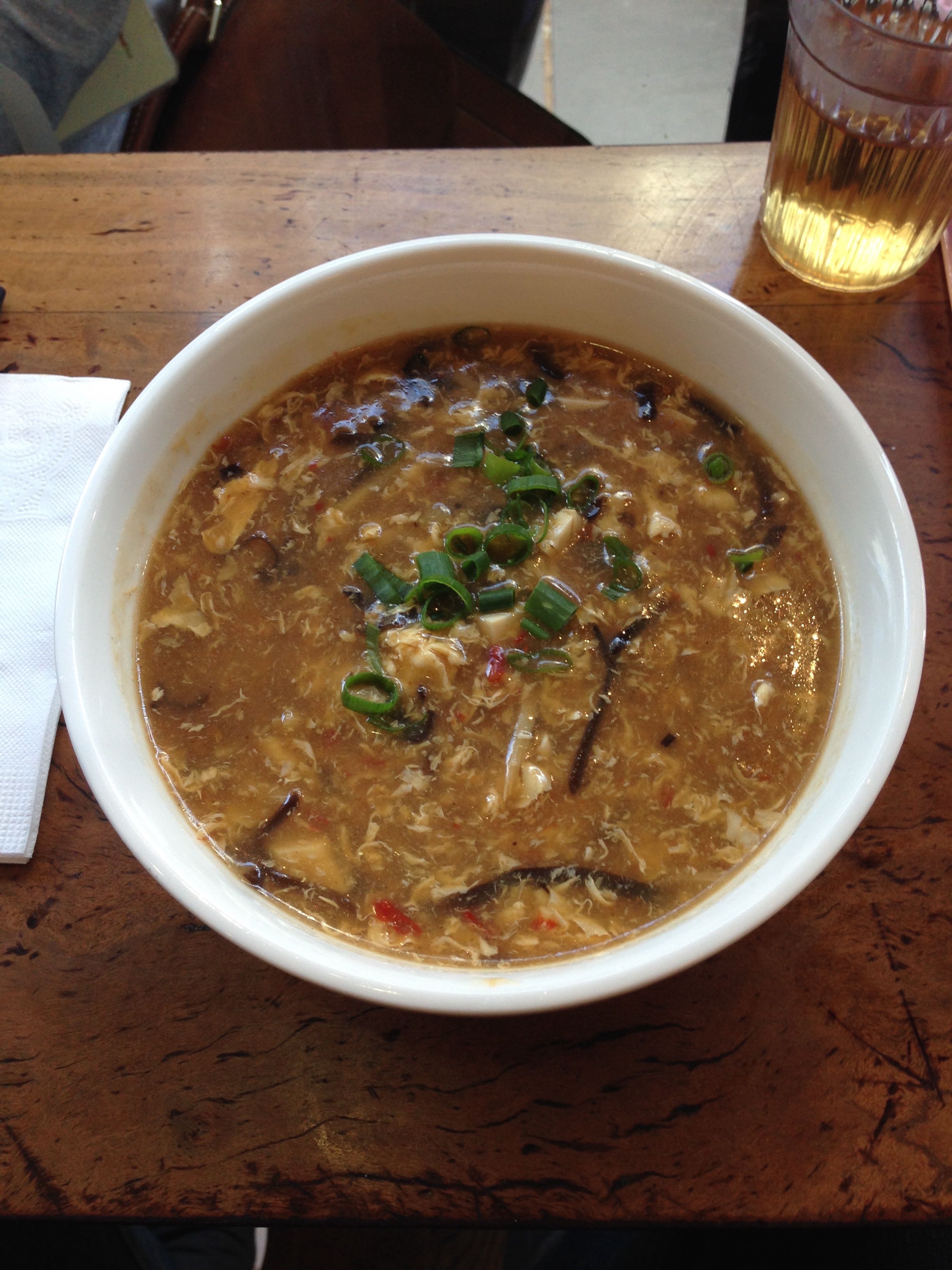 A very large bowl and has a lot of flavor. Good amount of spice and vinegar. Has heaps of ingredients of bamboo shoots, mushrooms, tofu wood ear fungus, chilies, spring onions and whipped in egg. It is the best hot and sour soup I have had.