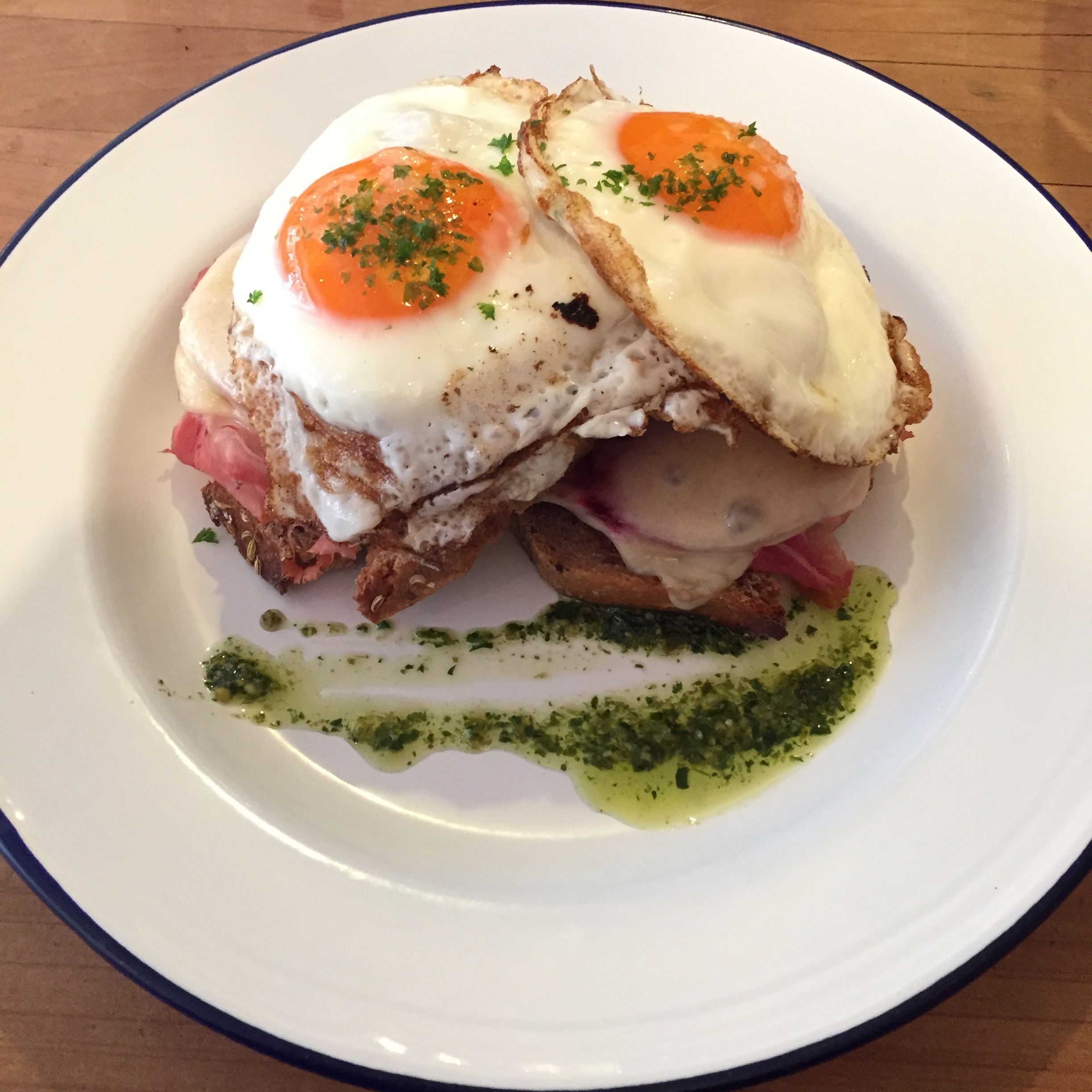 A lightly toasted rye sandwich with Emmental cheese, leg ham, beetroot, chives and fried eggs. This was a very nice sandwich. They make their own bread and shave off the ham from a leg that they have near the counter. The bread was nicely toasted and the crust was nice and crisp. The ham was beautiful and the melted cheese was very good. Add on top of that the eggs and the beetroot make it a very nice dish.