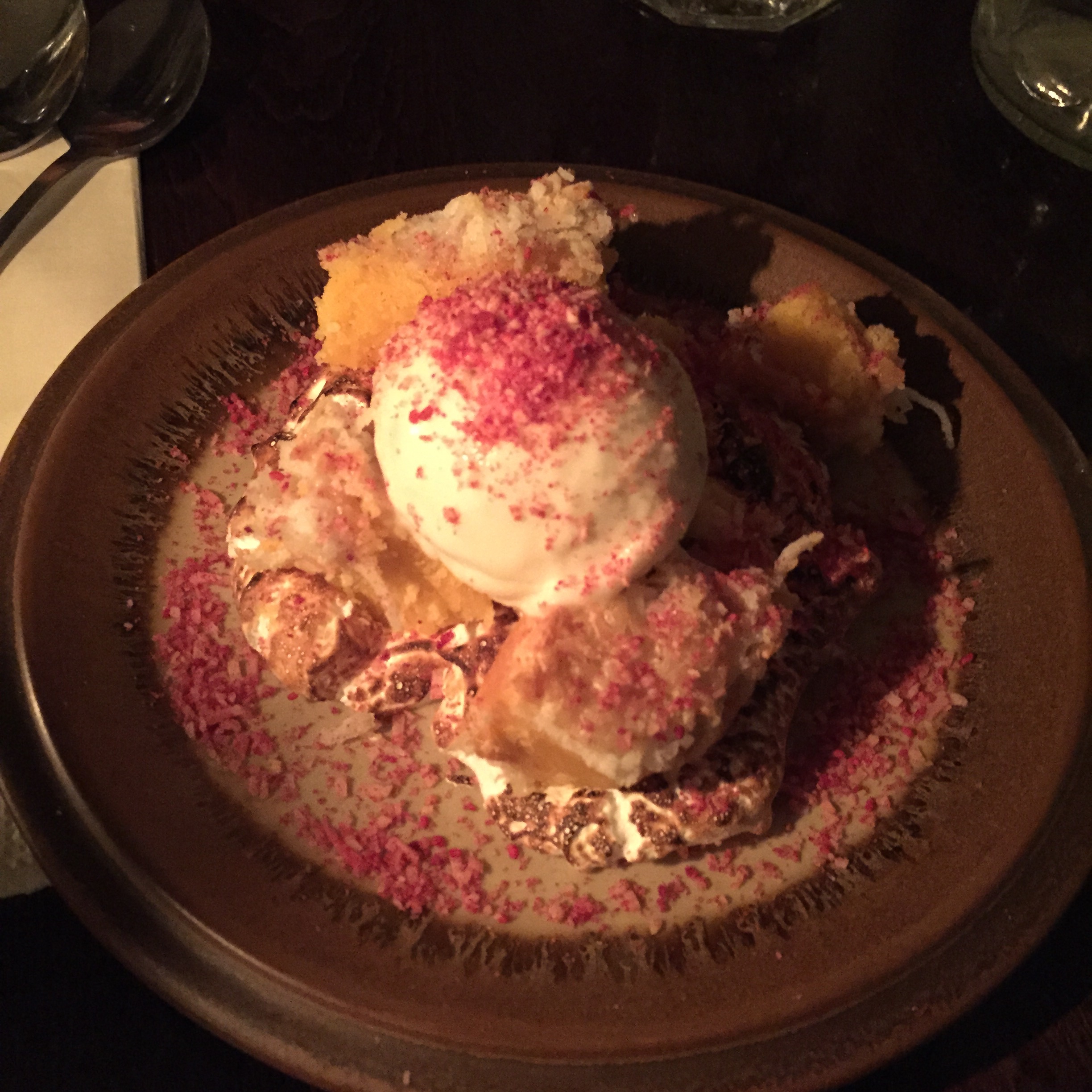 Again I was disappointed that this was on the set menu as this dish is also on the regular menu at Dukes. However, this is a very nice dessert. On the bottom is a slightly caramelised marshmallow like / fluffed egg white substance. Then there is the biscuit crumb of the louise cake. Also with the combination was the coconut sorbet sprinkle pinked coconut on top. Overall it worked very well and great to see a classic rejigged.