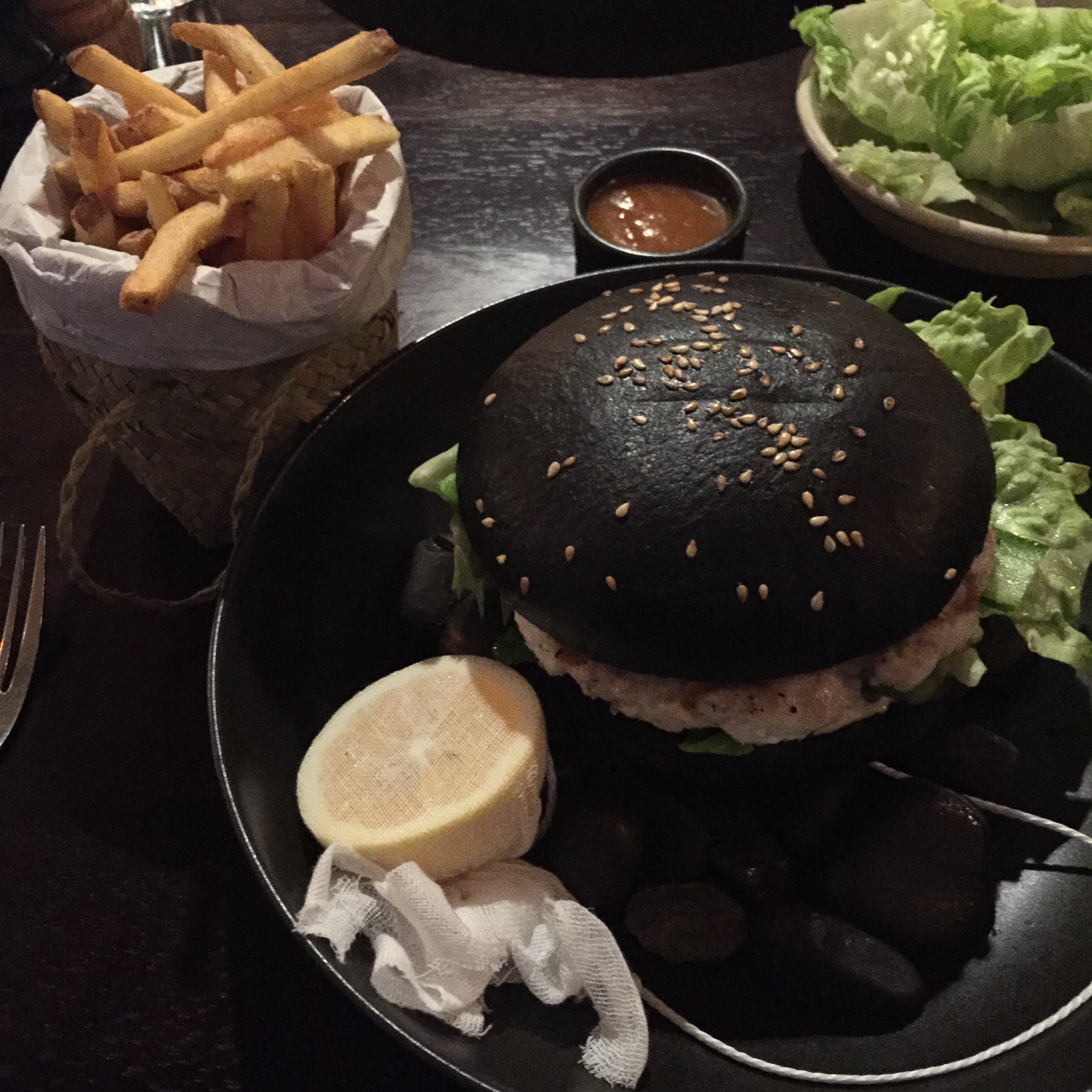 What presentation of a burger. There was a very clear theme of food from the sea with the presentation of this burger. Loved the kiti with the French fires inside, which looked and tasted like they are made on site. They were well seasoned and had a very good crunch to it and the dipping sauce was really nice. The burger was great and nice to see the lemon covered in cloth and had a fish hook tied onto it. The fish was very nice, especially with the sauce, pickled cucumber, the fresh lettuce and the Japanese mayonnaise, which had a nice wasabi kick to it. Overall a great huger.
