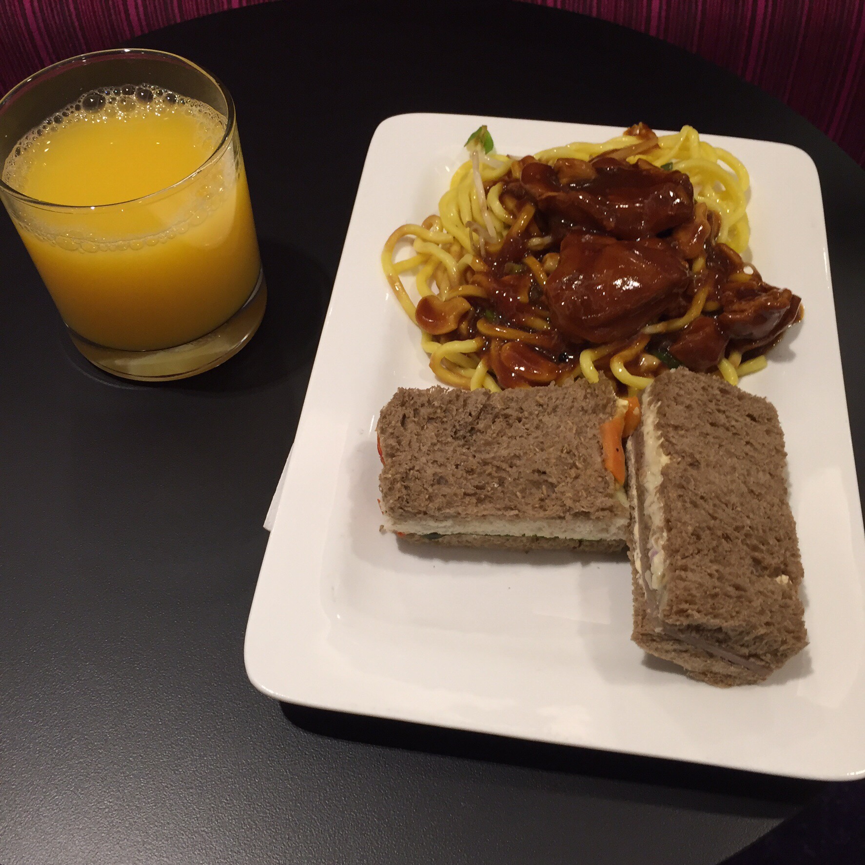 For our second meal; breakfast, we were given some fruit, yogurt and hot croissants with a selection of cereal, which I did not have. Then for our hot open I decided to go for the Shanghai noodles with tiger prawns, Chinese vegetables and some egg pancake. Overall not bad the prawns of course were the highlight and surprisingly not over cooked.