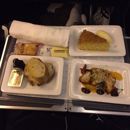 On the board one of the flight attendance that was going to be serve us introduce herself to us, which was really nice. Just after take off we got a hot hand towel and then it was time for supper. We got some warm selection of bread with olive oil and for the starter we had BBQ pork with hoisin sauce, lotus root and cashew nuts. This was very nice. For my main I had the Hapuka and scallops in abalone sauce, stir fried vegetables and rice. Was not bad of a meal. The scallops were nice and not over cooked, the fish was nice but I am not a fan of fleshy fish. For dessert there was a coconut lemon tart, which was very nice and a nice ending.