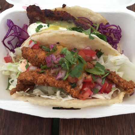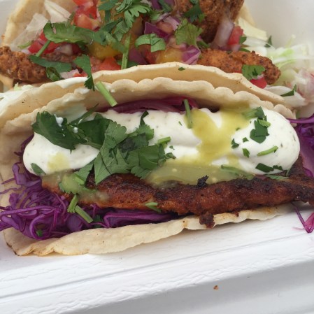 Was recommended to me by one of the people in the booth. The fish was sole and was nicely cooked, seasoned and not over done. The red slaw was really nice and the citrus tartare and the pickled onions gave the refreshing sour taste that works well with fish. Overall a nice taco