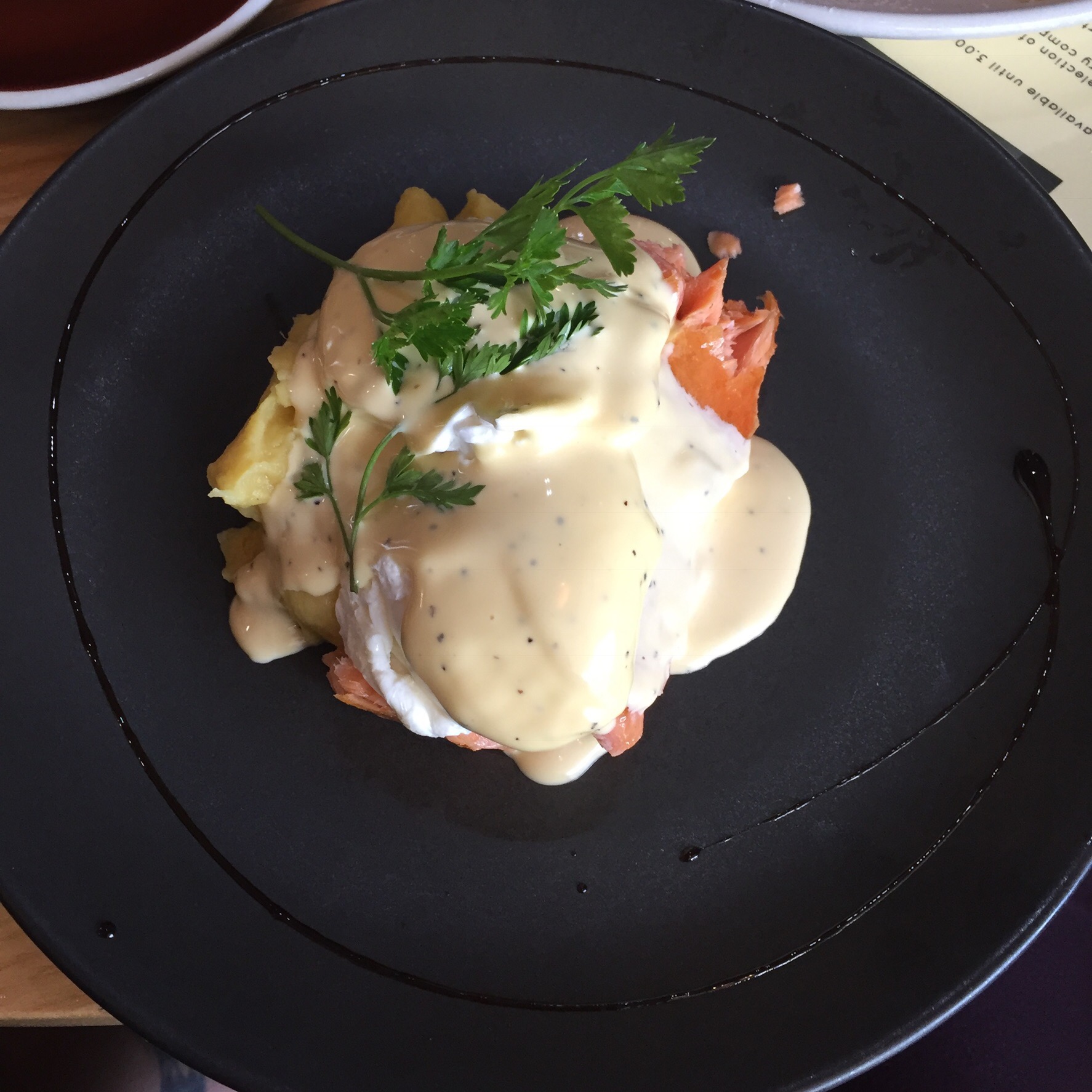 This is not what I expected for some strange reason but I am glad I ordered it. The kumara mash was really nicely seasoned and was really smooth, as fine they strained it through something. The smoked salmon was really nice, it had a nice smoked taste to it and there was a large chunk of it. The poached eggs were nicely cooked and to it off with the hollandaise and some balsamic syrup squirted around the dish. It was overall a really nice dish.