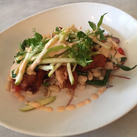 Buttermilk fried chicken with sriracha dressing, bean salad and green apple