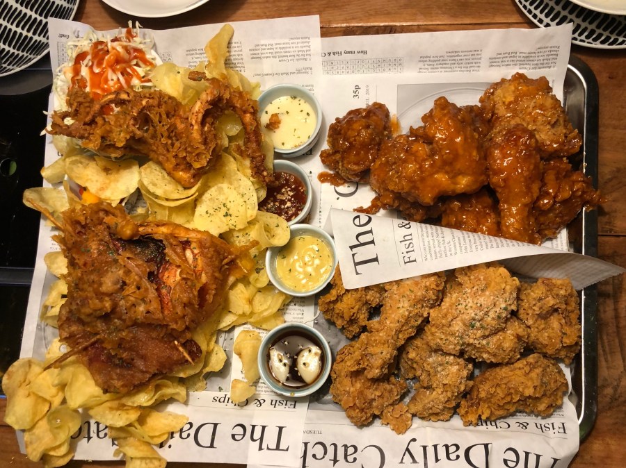 We also ordered which I suspect is their most popular dish, Chicken, Squid, Chips Combo with the Original and Sweet and Spicy chicken. First off, the Chips, these are not your typical ships. They taste like they are made on-site and I love the crunch of the chip but then also you get some that are not entirely cooked and are soft. The squid tasted really nice and originally we didn’t get anything to help us cut it, but we asked for a knife and they gave us a pair of scissors which made so much more sense. You can add the dipping sauces to it, which I think were, Honey soy, Mustard Aioli, Sweet and Spicy, and plain Aioli/ Mayo. My fav, the honey soy sauce.