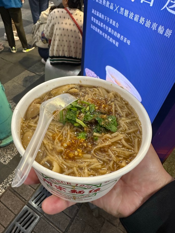 I was walking around Ximending night market and saw this long line of people queueing to try some food. After investigating, I discovered this place only served one dish, and you can buy either large or small. I also found that this place is super famous for its one dish of flour rice noodles.